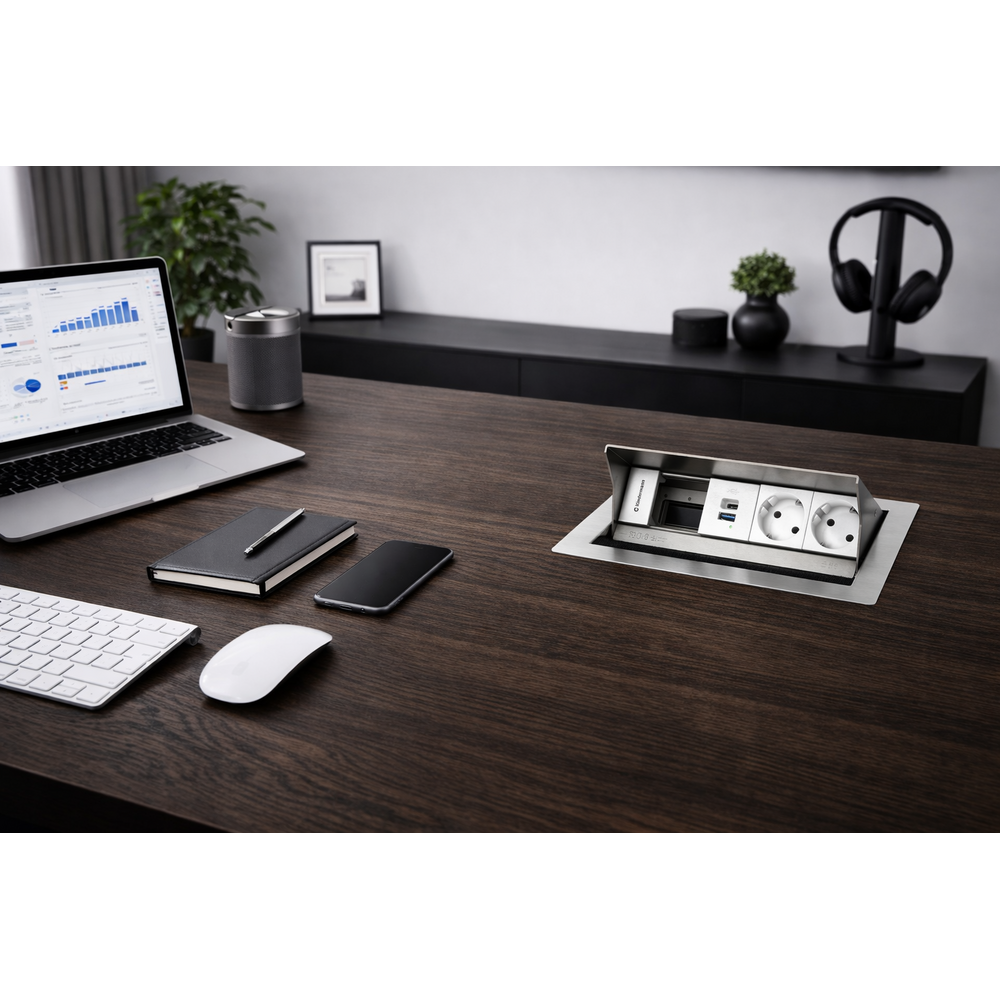 Deze specifieke tafelunit is voorzien van 2x Stroom, 1x een USB Laadstation met een USB C en een USB A oplader. Waarbij de USB A geschikt is voor QuickCharge 3.0 met een laadprofiel van 5V/3A, 9V/3A, 12V/2,5A, 20V/1,5A en de USB C geschikt is voor PowerDelivery 3.0 met een laadprofiel van 5V/3A, 9V/3A, 12V/2.5A, 15V/2A, 20V/1.5A. Worden beide gelijktijdig gebruikt, dan is het maximaal 2x 5V/1,2 A.