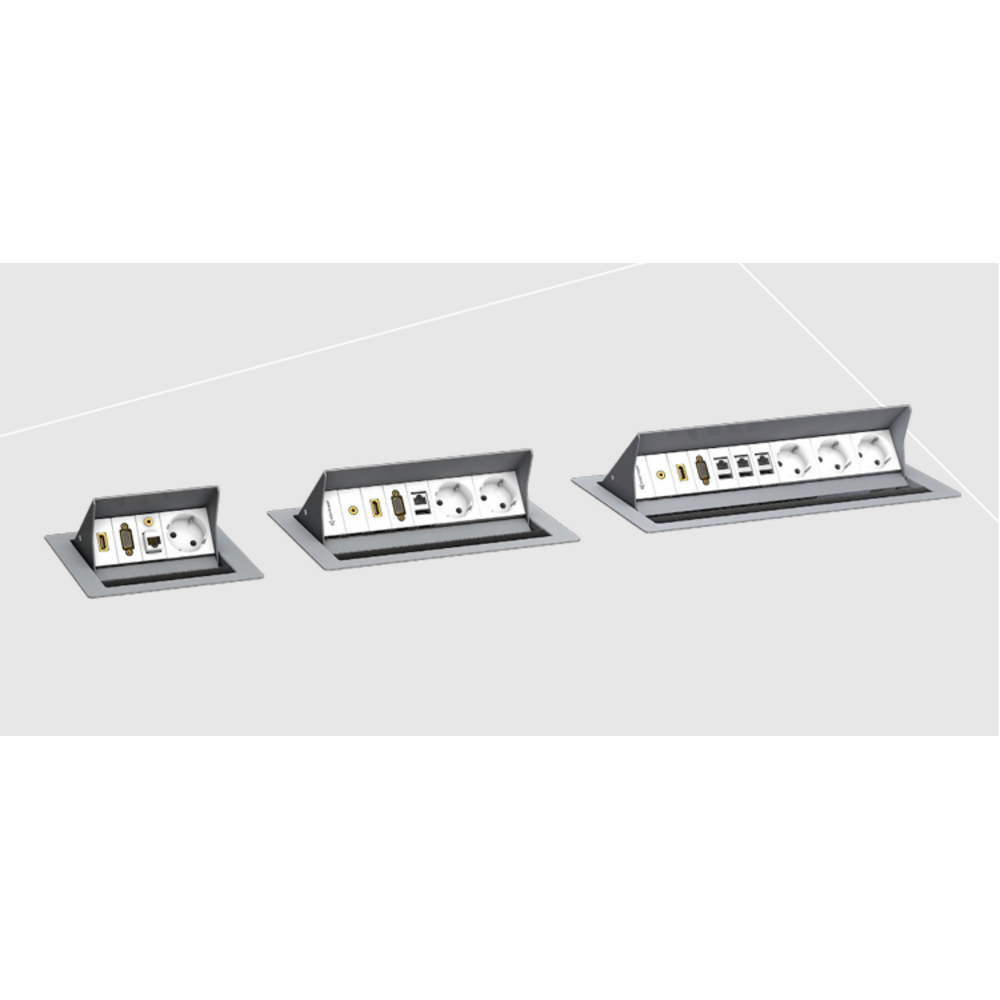 Doordat de tafelunit gemaakt is van aluminium, weet je dat hij tientallen jaren mee kan. Dankzij de flexibiliteit en het eenvoudig in klikken van de modules. Kun je ook bij verandering van aansluitingen eenvoudig schakelen. Daarnaast is het een kwestie van een gat op de juiste afmeting in de vergadertafel of het bureaublad maken. De gewenste modules in de unit klikken, de tafelunit vanaf de bovenzijde erin plaatsen en de bekabeling vanaf de onderzijde van de tafel aansluiten naar de apparatuur. Indien gewenst kun je de unit eventueel met een kit afwerken, maar dat is niet noodzakelijk.