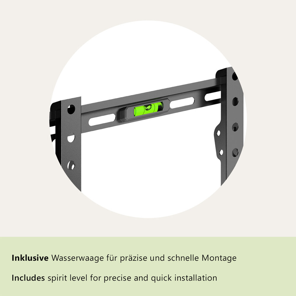Een slim ontworpen TV beugel die zeer eenvoudig werkt. Bewust gemaakt met een open ontwerp aan de achterzijde en met een afstand van 22 mm vanaf de wand tot de achterzijde scherm dat laat voldoende ruimte voor het wegwerken en aansluiten van de kabels . Met behulp van een schroef aan de onderzijde van de verticale armen kun je het scherm met de verticale armen borgen aan het frame op de wand.