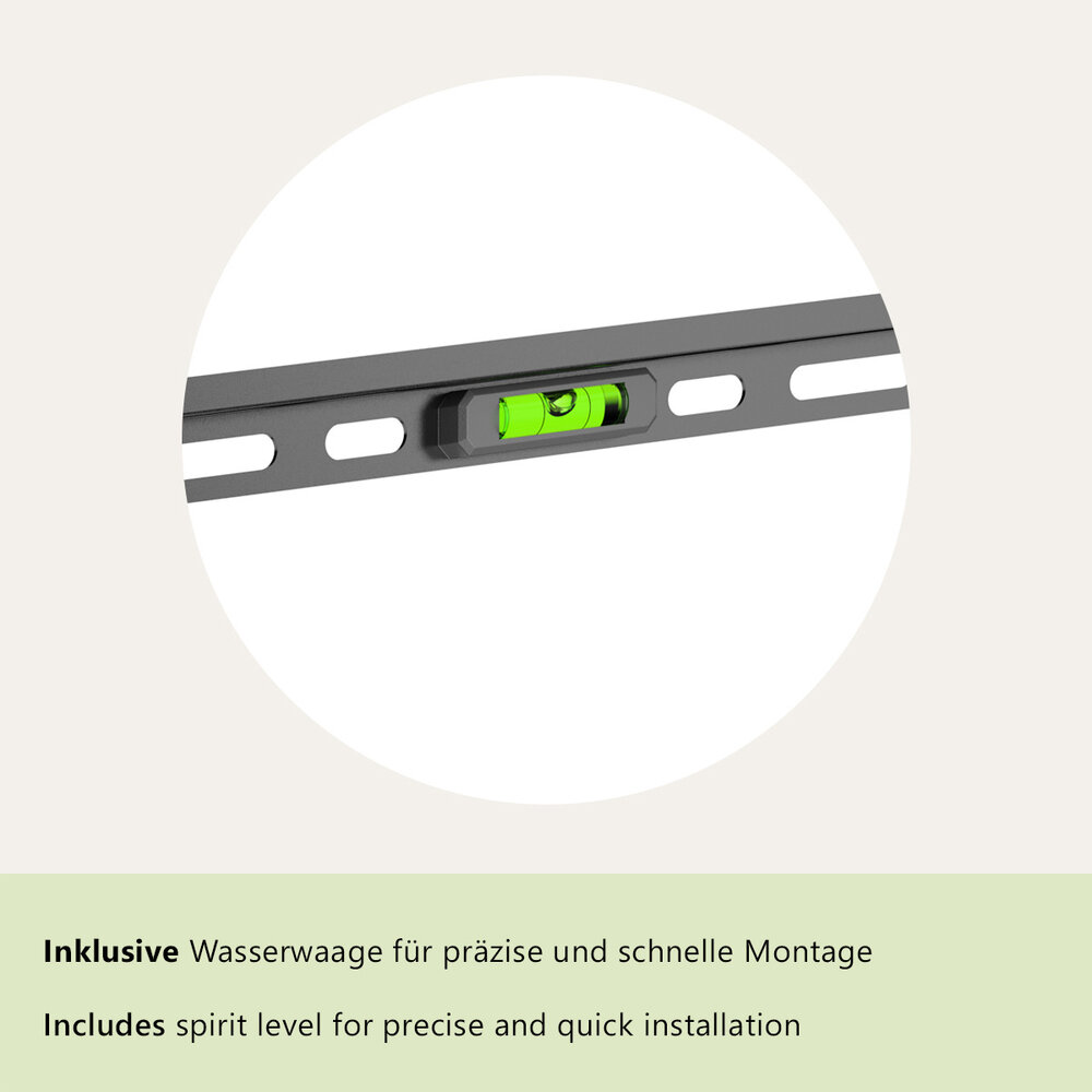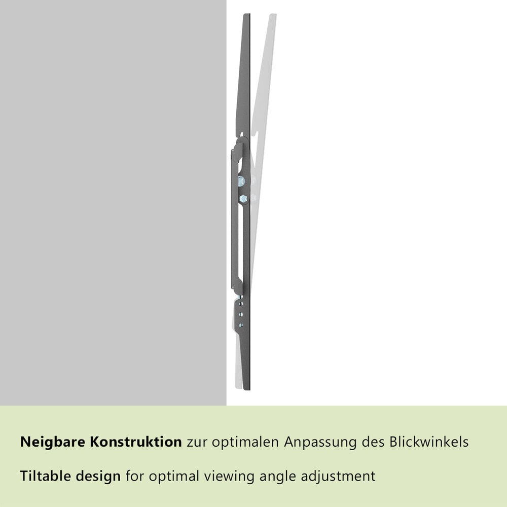 Een slim ontworpen TV beugel die zeer eenvoudig werkt. Bewust gemaakt met een open ontwerp aan de achterzijde en met een afstand van 22 mm vanaf de wand tot de achterzijde scherm dat laat voldoende ruimte voor het wegwerken en aansluiten van de kabels. Daarnaast heeft deze beugel ten opzichte van de HEG 3 L de mogelijkheid om de TV licht te kantelen tot 8°
