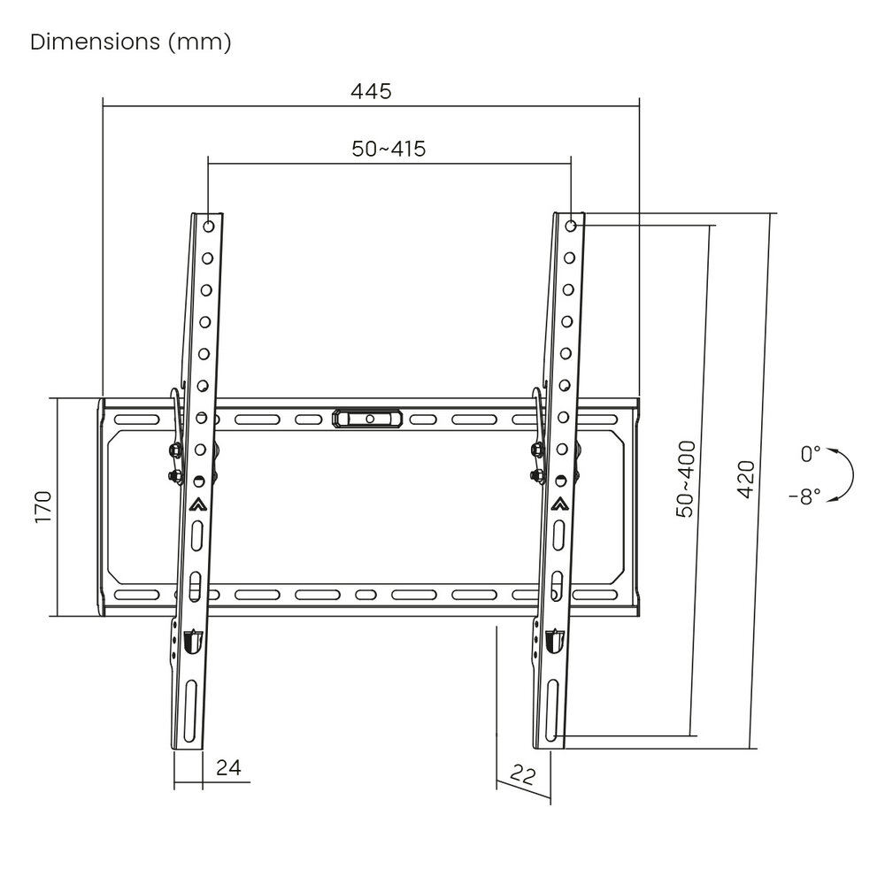 In tegenstelling tot de TV Standaard HEG 1 L, die strak tegen de wand zit zonder enige bewegingsmogelijkheid kun je bij deze TV beugel de TV tot 8° voorover kantelen. Uiteraard is dit het maximale bij een 43 inch scherm, mocht er een groter scherm aan gehangen worden, die wel binnen de marges van de VESA maat en het gewicht valt. Zal de kantelhoek iets kleiner worden.