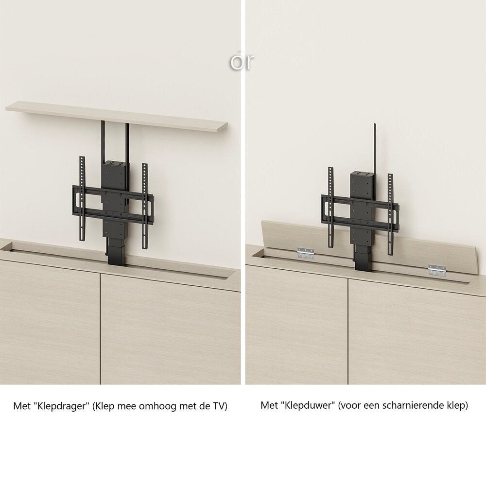 Naast de keuze die wij hierboven omschrijven. Heb je ook vrijheid in de keuze om de klep mee omhoog te laten gaan boven de TV, of dat de klep wanneer de lift uit de kast omhoog komt wordt open geduwd. In het laatste geval, dient de klep uiteraard wel van scharnieren te zijn voorzien.