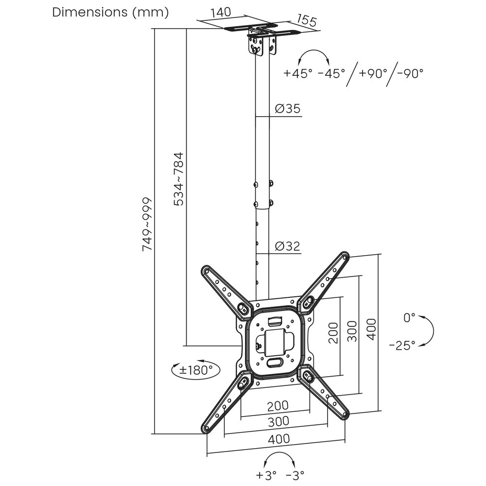 Totale buis in lengte verstelbaar van 749 t/m 999 mm (hoogte hart VESA tussen 534 t/m 784 mm)