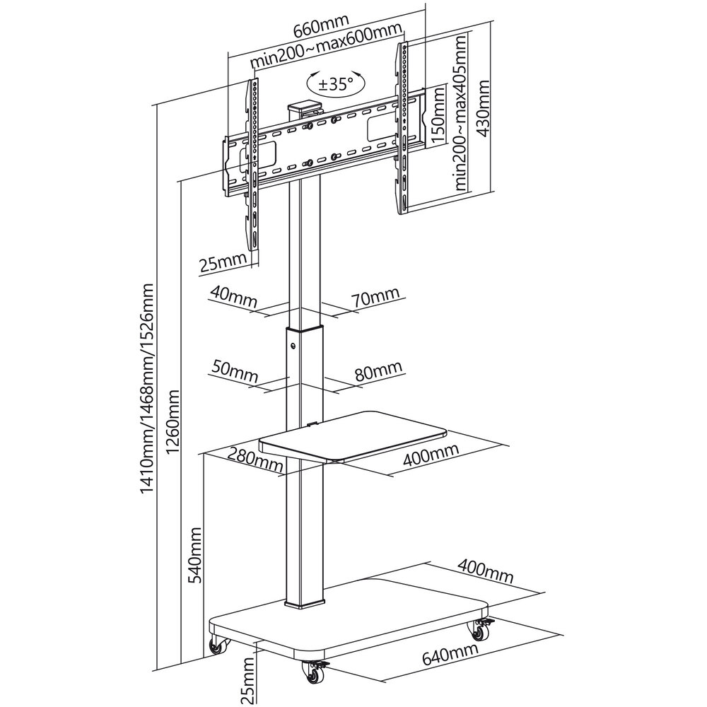 | Afmetingen: | Vloerplaat 660 x 400mm, TV standaard 660 x 400 x 1526 mm |