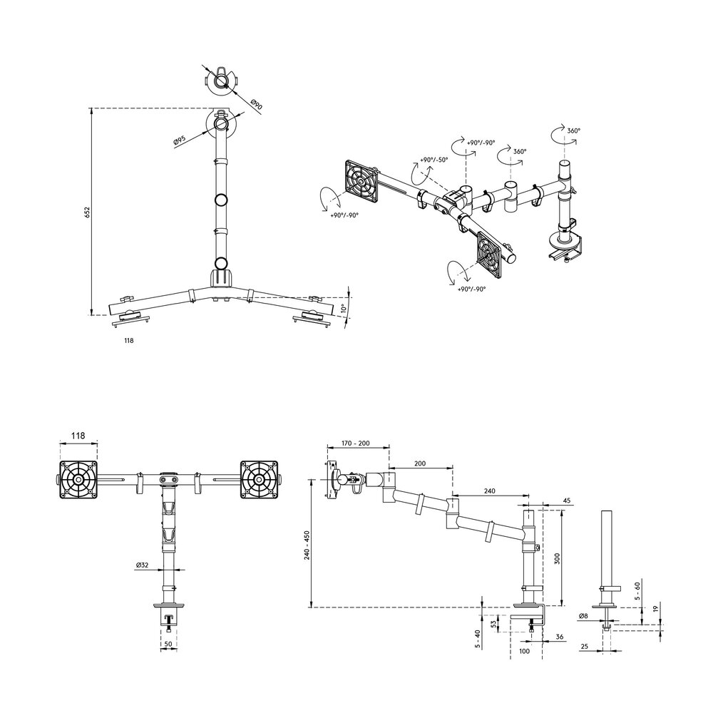 Uiteraard behoort draaien, kantelen en roteren tot de mogelijkheden. Deze dubbele monitorarm wordt geleverd met een bladklem en een bladdoorvoer. De bladdoorvoer is geschikt voor bureaus met een dikte van 5 t/m maximaal 60mm en het bladklem systeem voor bureaus met een dikte van minimaal 5mm tot maximaal 40mm dik. De hoogte is eenvoudig in te stellen met behulp van een draaiknop. Dankzij de meegeleverde tool is de installatie zo eenvoudig mogelijk gemaakt.